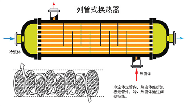 列管式换热器是目前应用领域最广的一种换热器。它主要由壳体、管板、换热管、 封头、折流挡板等组成。所需材质可分别采用普通碳钢、紫铜、或不锈钢制作。在进 行换热时,一种流体由封头的连结管处进入,在管内流动,从封头另一端的出口管流出 ,这称之管程;另一种流体由壳体的接管进入,从壳体上的另一接管处流出,这称为壳程 O可广泛用于热电、厂矿、石油化工、城市集中供热、食品医药、能源电子、机械轻 工等领域。