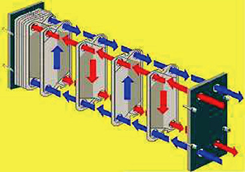 板式换热器是由一系列具有波纹形状的金属片叠装而成的一种新型高效换热器。各种板片之间形成薄矩形通道,通过板片进行热量交换。板式换热器是液-液、液-汽进行热交换的理想设备。它具有换热效率高、热损失小、结构紧凑轻巧、占地面积小、安装沽洗方便、应用广泛、使用寿命长等特点。